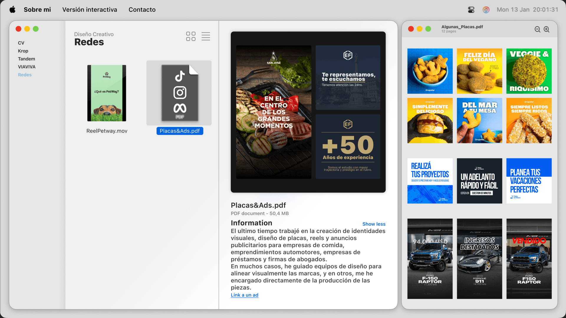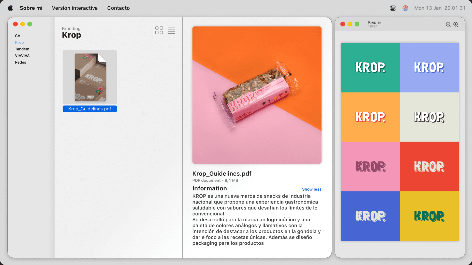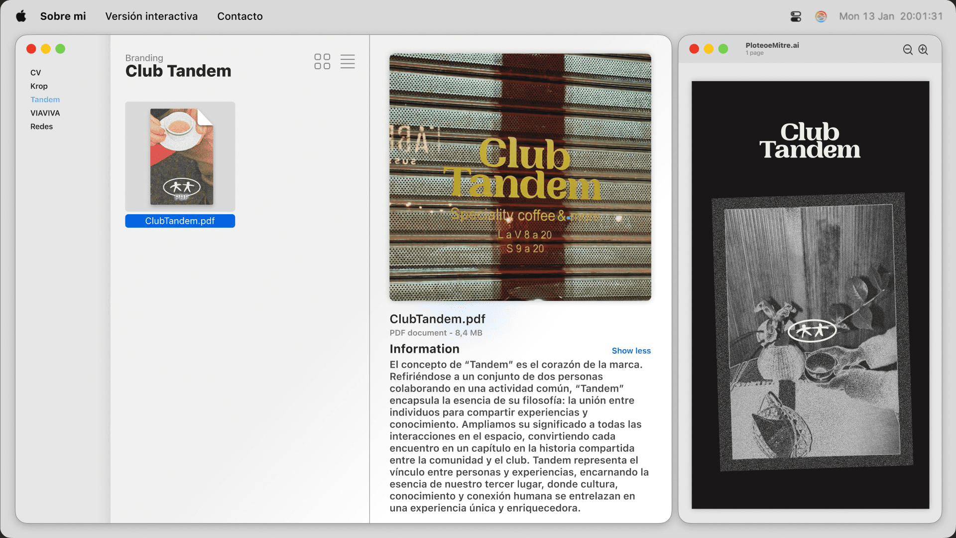 La idea fue salirme del típico scroll y construir una experiencia que se sienta más cercana a cómo trabajo, a cómo pienso. Llegué a una interfaz tipo escritorio de mac, medio caótica, medio cruda, que representa bastante bien mi manera de tener todo a mano. Busqué imitar lo más posible una interfaz real, pero exagerando algunos detalles para mejorar la legibilidad y hacerlo más navegable.