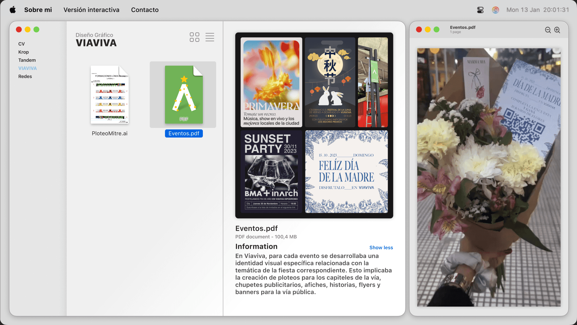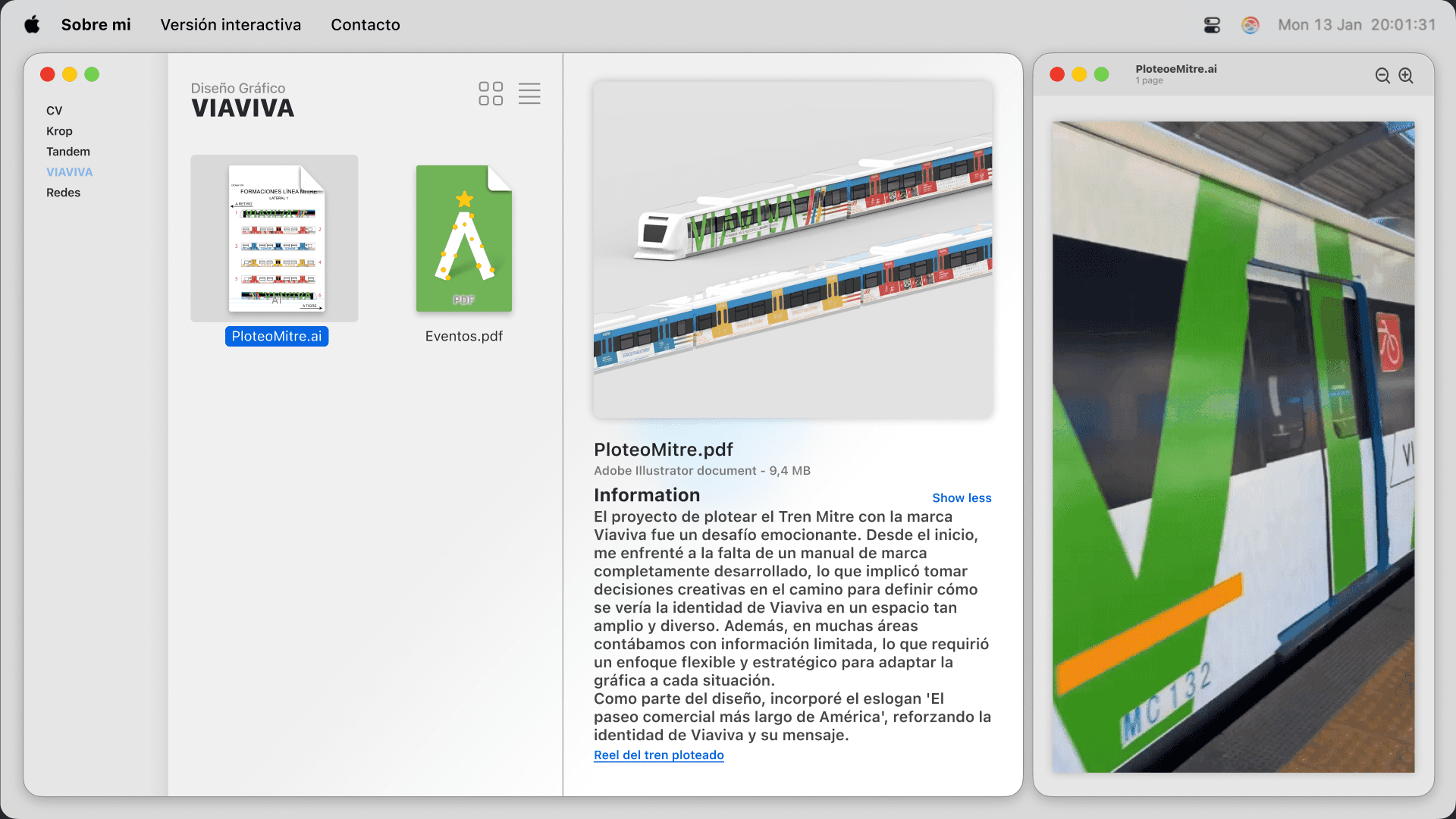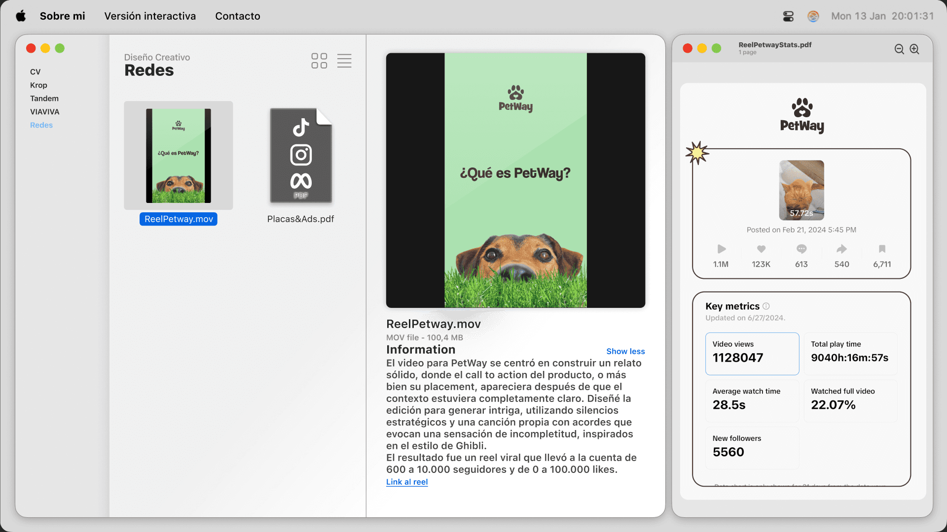 La idea fue salirme del típico scroll y construir una experiencia que se sienta más cercana a cómo trabajo, a cómo pienso. Llegué a una interfaz tipo escritorio de mac, medio caótica, medio cruda, que representa bastante bien mi manera de tener todo a mano. Busqué imitar lo más posible una interfaz real, pero exagerando algunos detalles para mejorar la legibilidad y hacerlo más navegable.